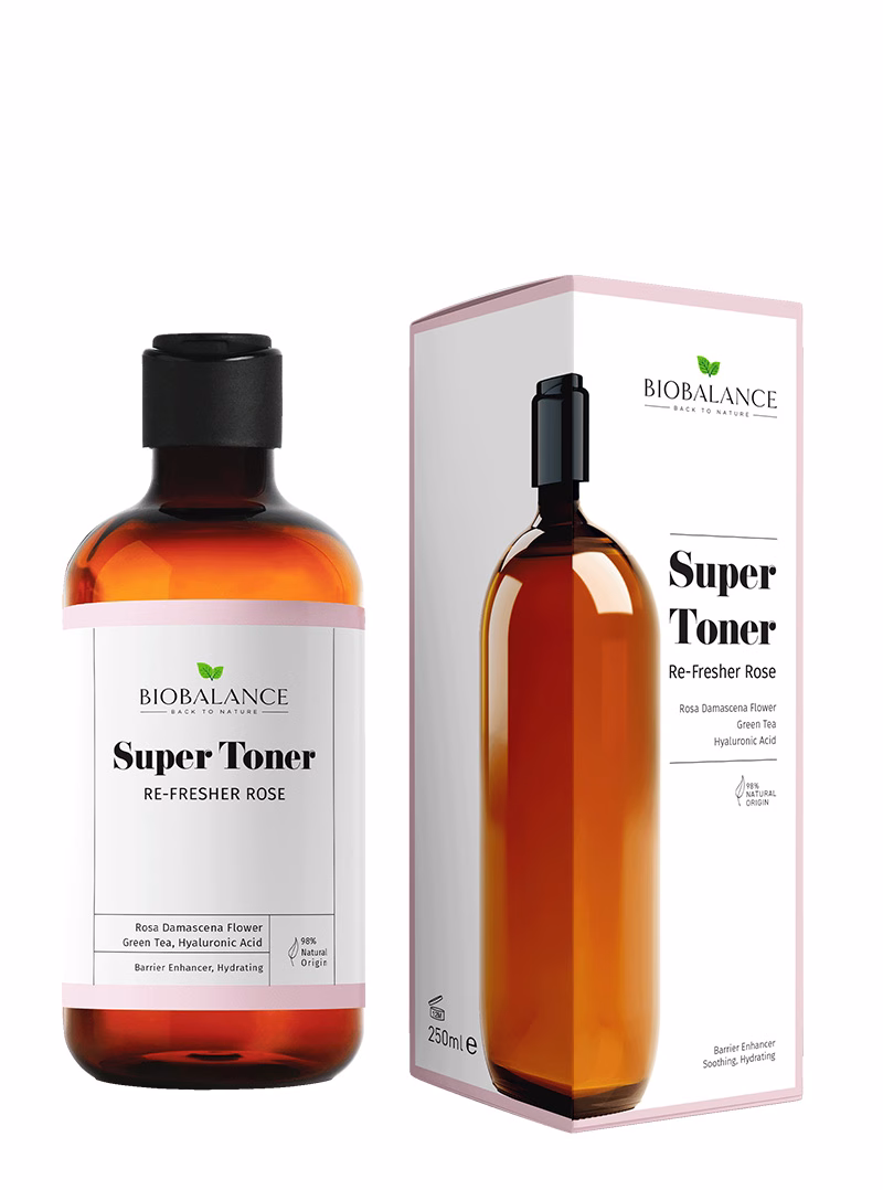 Re-Fresher Rose Super Toner is enriched with rosa damascena flower water, green tea extract, and hyaluronic acid to deliver deep hydration, calm irritation, and strengthen the skin barrier. With 98% natural origin ingredients, this toner gently removes the final traces of makeup, soothes redness, and refreshes the complexion while leaving skin soft, balanced, and rejuvenated. Dermatologically tested, it is designed for daily use to enhance hydration, minimize sensitivity, and restore a healthy glow.