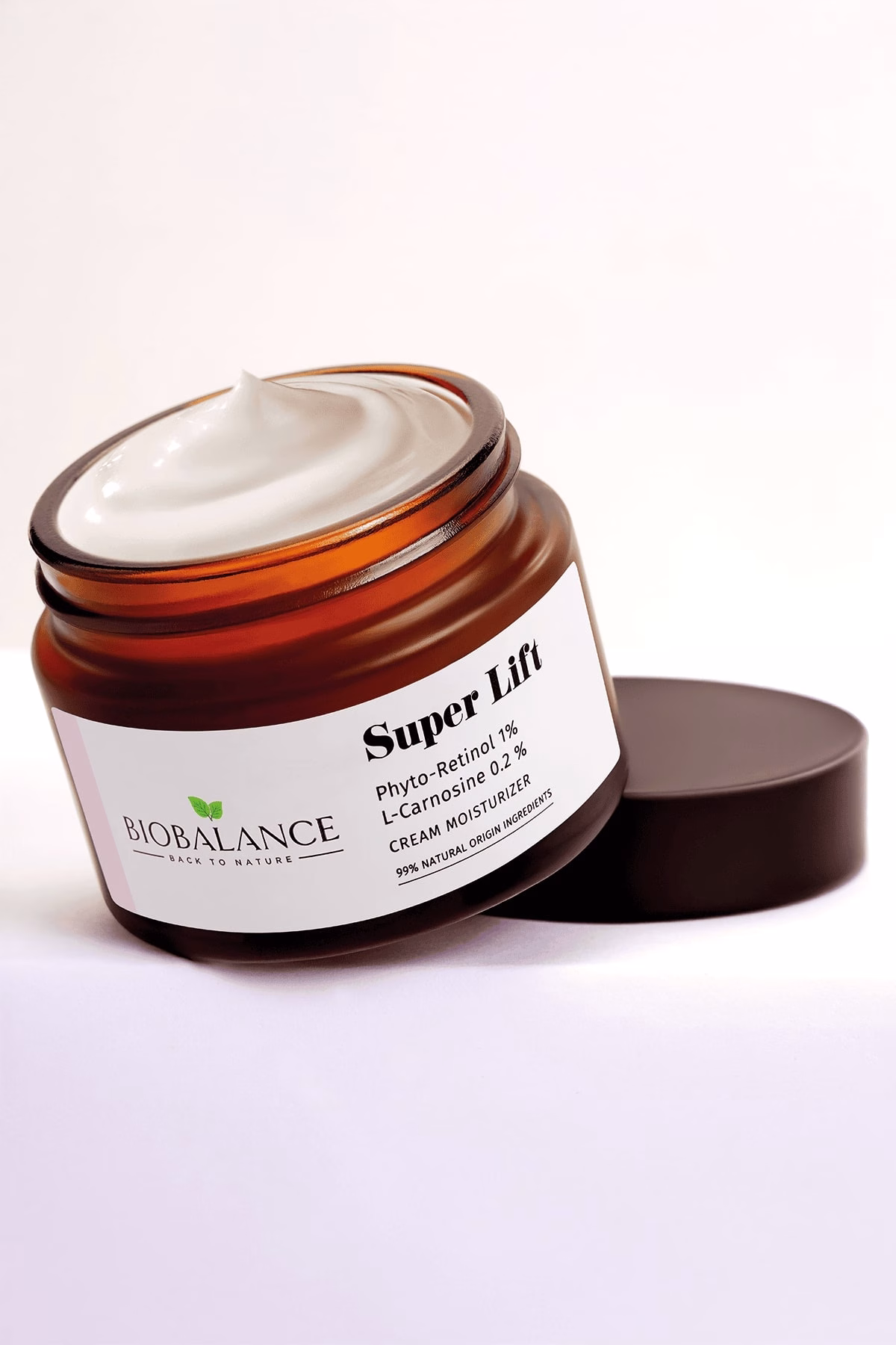 Super Lift Cream combines 1% Phyto-Retinol (Bakuchiol) and 0.2% L-Carnosine to strengthen the skin barrier, reduce fine lines and wrinkles, boost collagen production, and prevent dark spots. Its natural-origin formula also protects against blue light damage, leaving skin firm, smooth, and radiant.